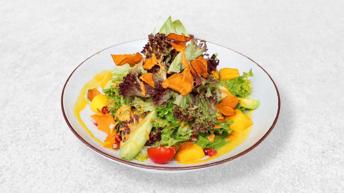 Avocado, Mango, Süßkartoffelchips, Granatapfel, Cherrytomaten Babyspinat, bunter Blattsalat, frische Kresse, spicy Mayonnaise, Mango-Dressing