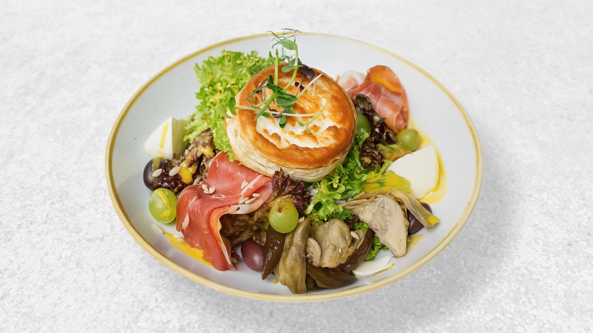 Gratinierter Ziegenkäse, Mozzarella, Prosciutto, gegrillte Melanzani, Oliven, Artischocken, Granatapfel, Trauben, Sonnenblumenkernen, bunter Blattsalat, frische Kresse