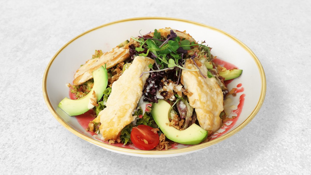 Knusprige Hühnerstreifen, Cherrytomaten, Gurken, Avocado, Crunchy Onion, Radieschen, bunter Blattsalat, frische Kresse, Sesam-Honey-Dressing, Himbeer-Dressing