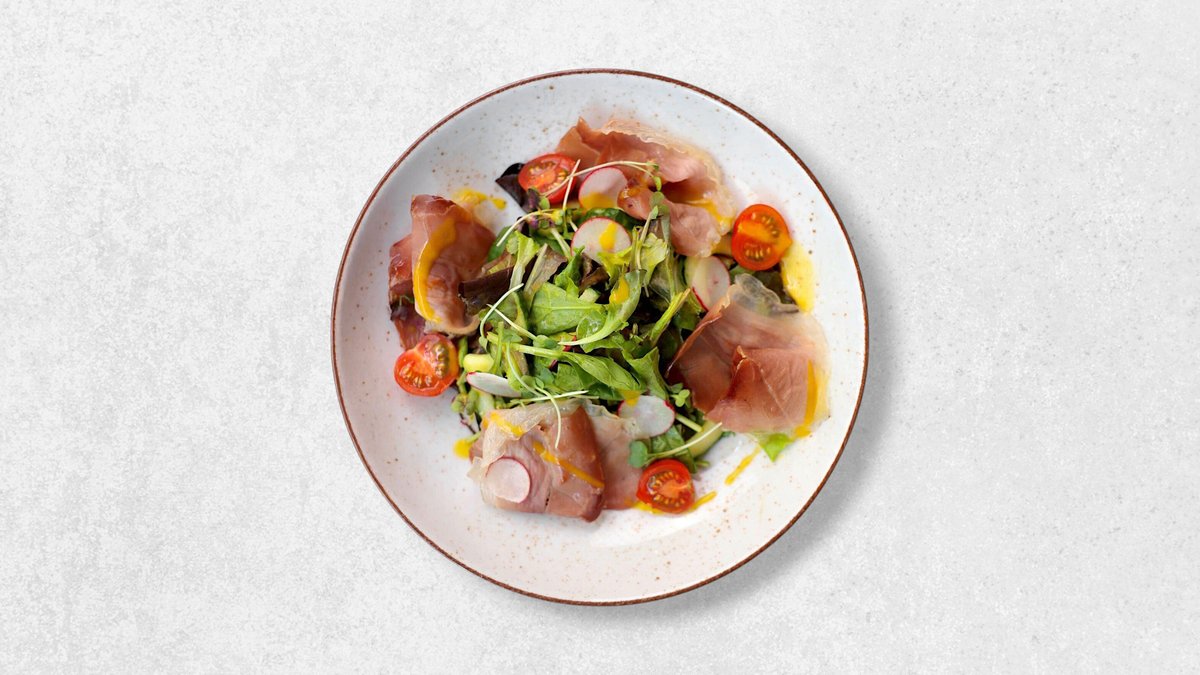 Knuspriger Parmaschinken, Cherrytomaten, Gurken, Radieschen, bunter Blattsalat, frische Kresse