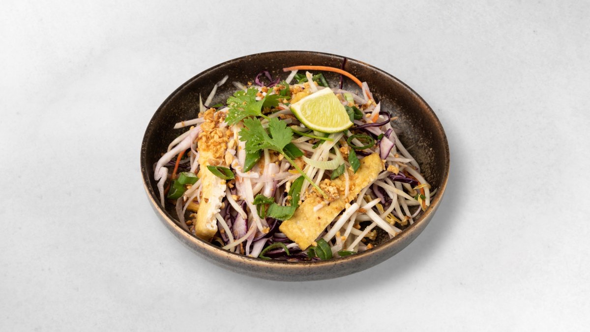 Tofu in Erdnusssoße, Salat auf Jasminreis