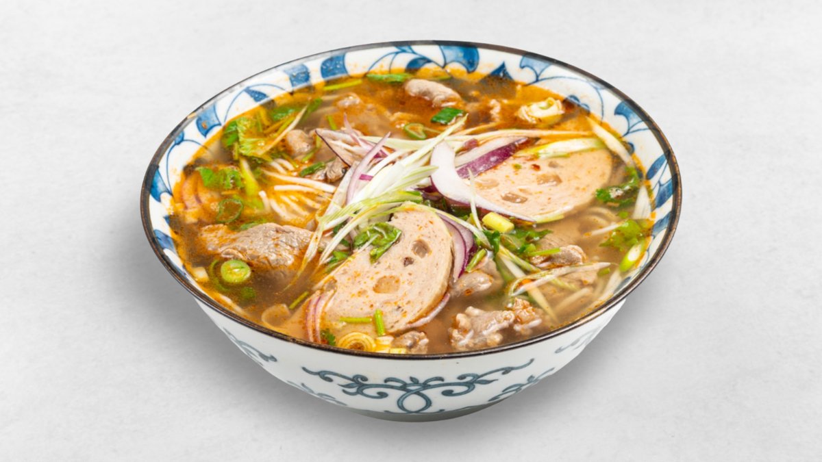 Alle Gerichte werden mit Reisnudeln, Kräuter, Erdnuss, Röstzwiebel und Salat mit der warmen vietnamesischen Limetten-Fischsoße zubereitet