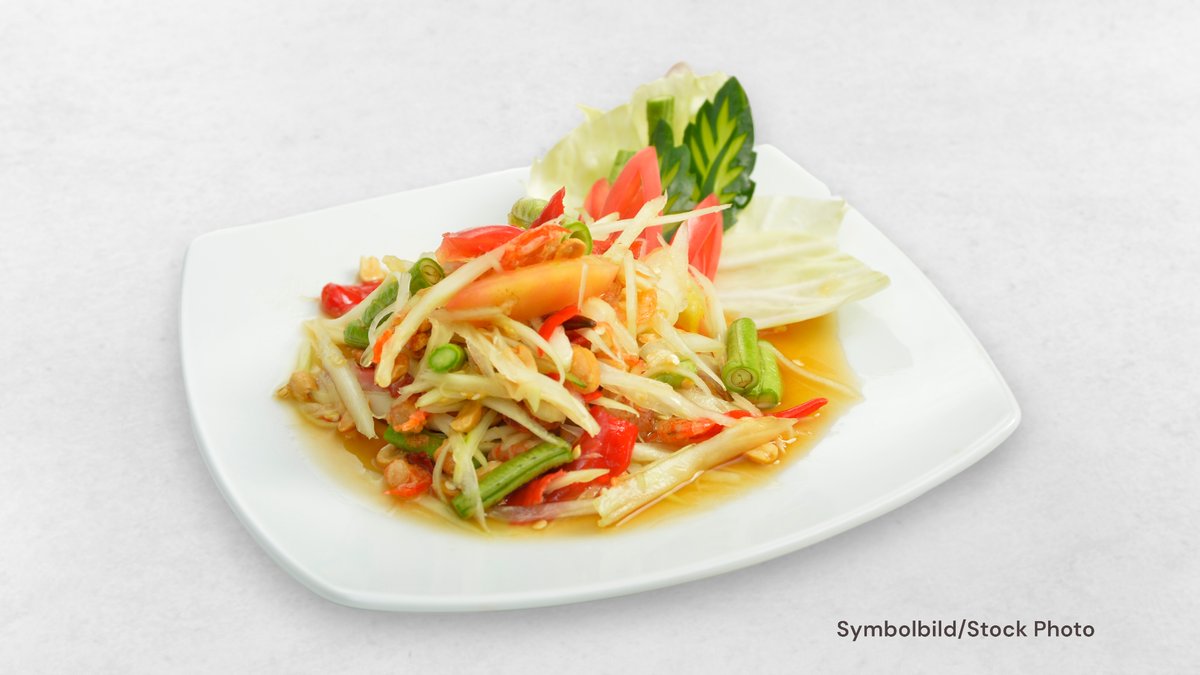 Knusprige Ente, Mango-Curry, Reis, Salat