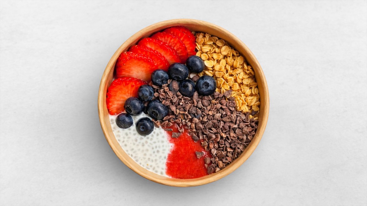 Heidelbeeren, Kakaonibs, Chia-Pudding, Erdbeere-Püree, Granola Erdbeeren sind ein saisonales Produkt und in den Wintermonaten nicht verfügbar.