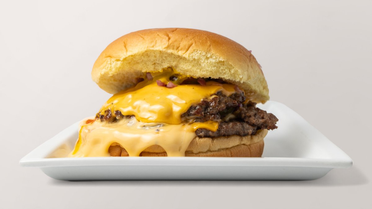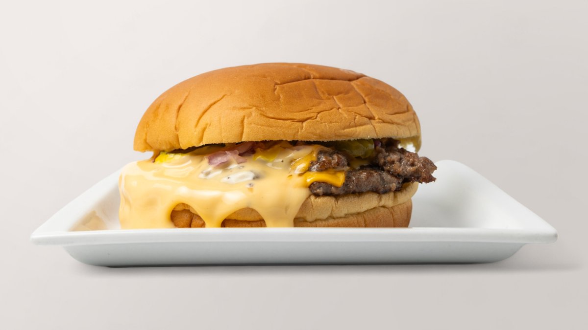 2 Patties 140g Rinderhackfleisch, Cheddar, Zwiebel, Essiggurken, Ketchup, amerikanischer Senf, Brioche Bun