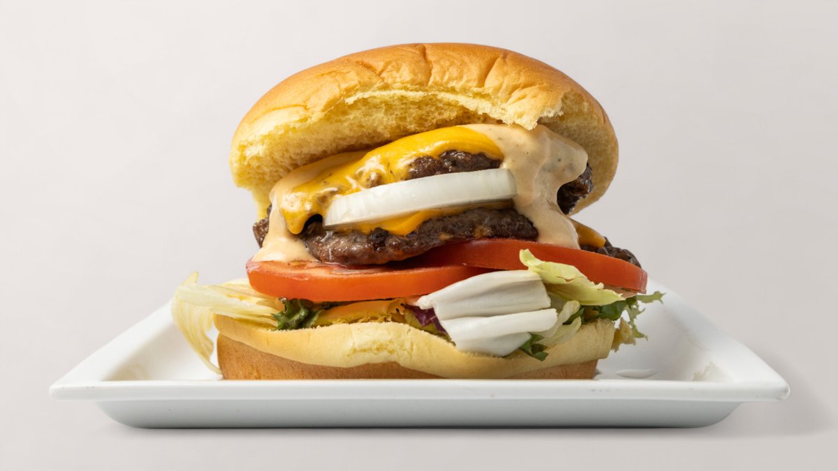 2 Patties 140g Rinderhackfleisch, 2x Scheiben Cheddar, Eisbergsalat, Zwiebel, Tomaten, Manny's hausgemacht 1000 Island Soße, Brioche Bun