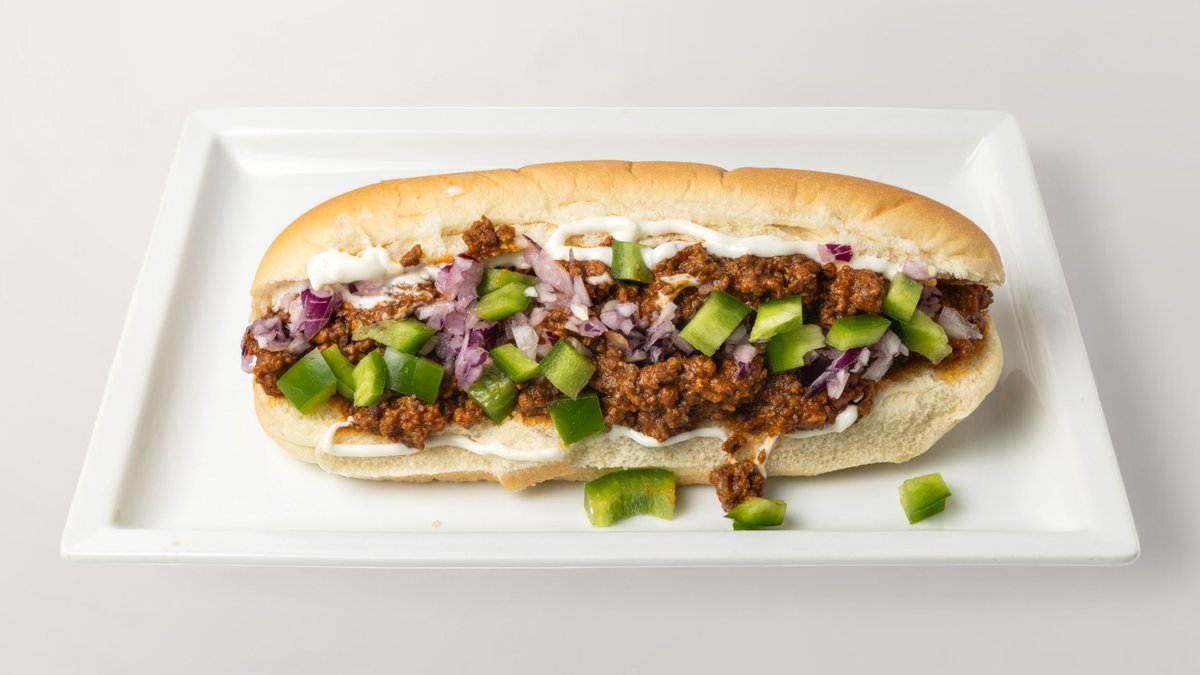 140g Rinderhackfleisch in sloppy Soße, Mayonnaise, Paprika, Zwiebel, Brioche Baguette