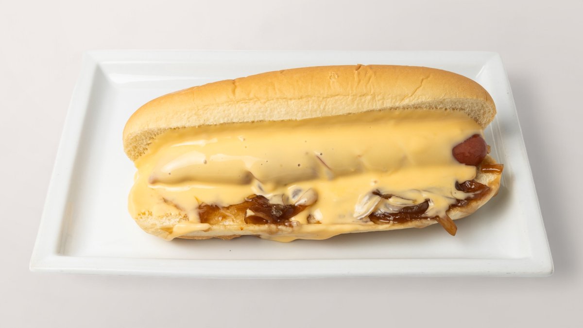 100% Rindfleisch Wurst, Karamelisierte Zwiebel, Cheddar Cheese-Soße