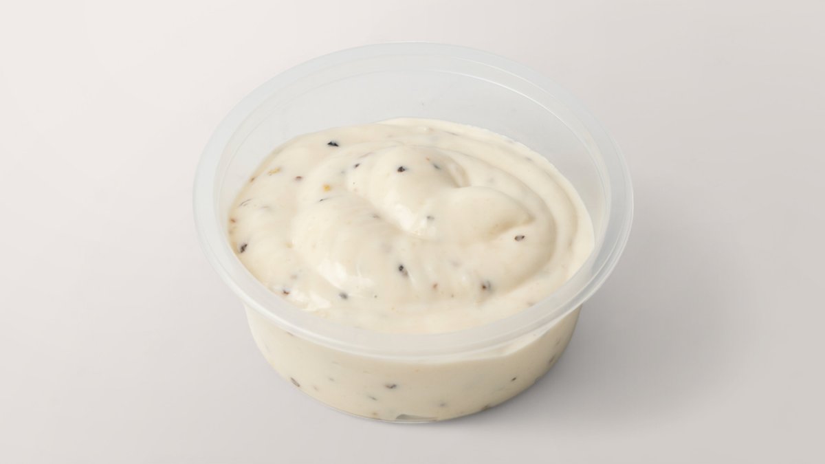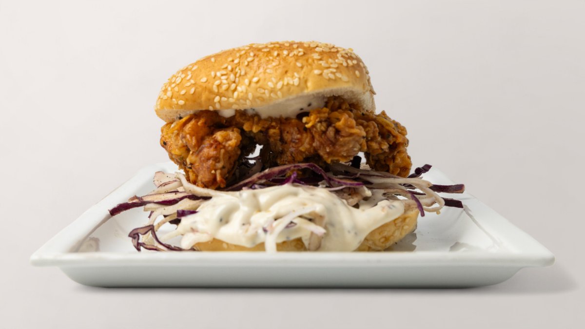 Paniertes, in Buttermilch eingelegtes, Hühnerfleisch von der Keule, hausgemachter Coleslaw, Knoblauch-Pfeffer-Soße, Sesam Bun