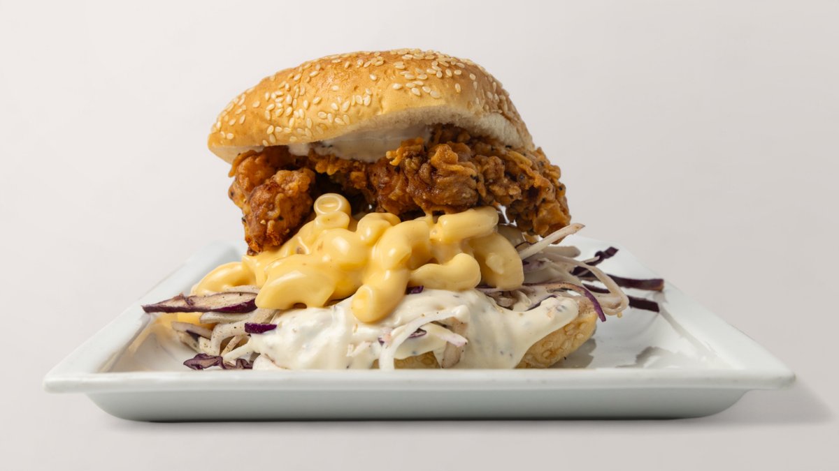 Paniertes, in Buttermilch eingelegtes, Hühnerfleisch von der Keule, hausgemachter Coleslaw, hausgemachte Knoblauch-Pfeffer-Soße, Mac, Cheese, Sesam Bun