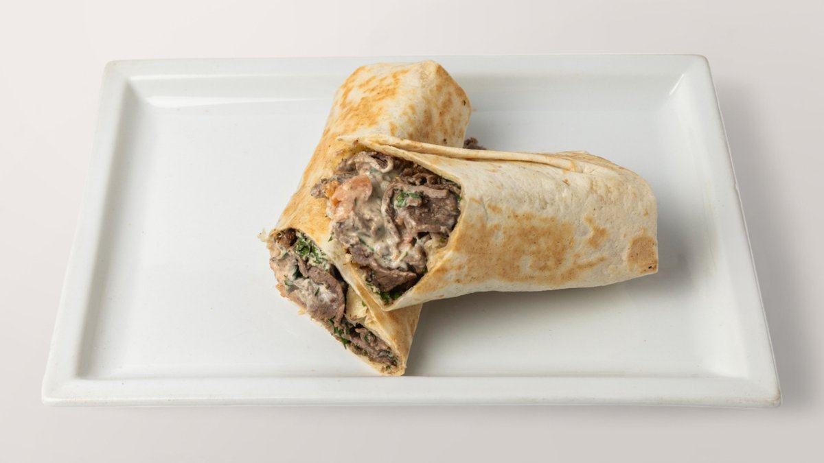 Dünne Scheiben Rindersteak, gegrillt mit Tomaten, frischer Petersilie, Tahinasauce