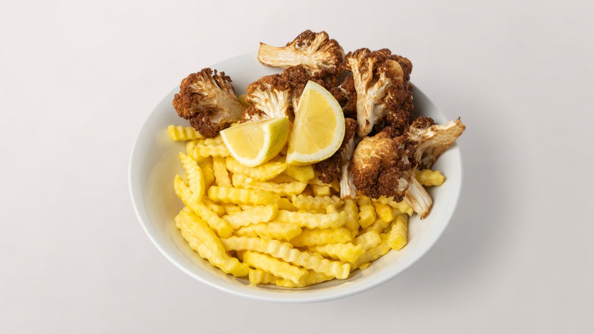 Frittierter Blumenkohl, Wave Fries, Tomaten, Zitronensaft, Tahinisauce, Petersilie