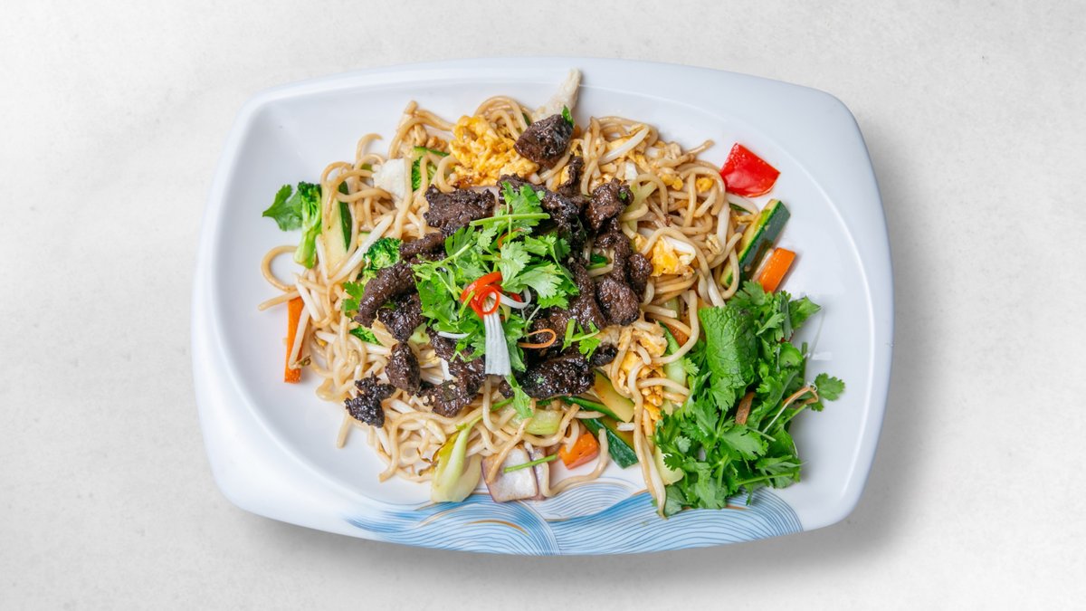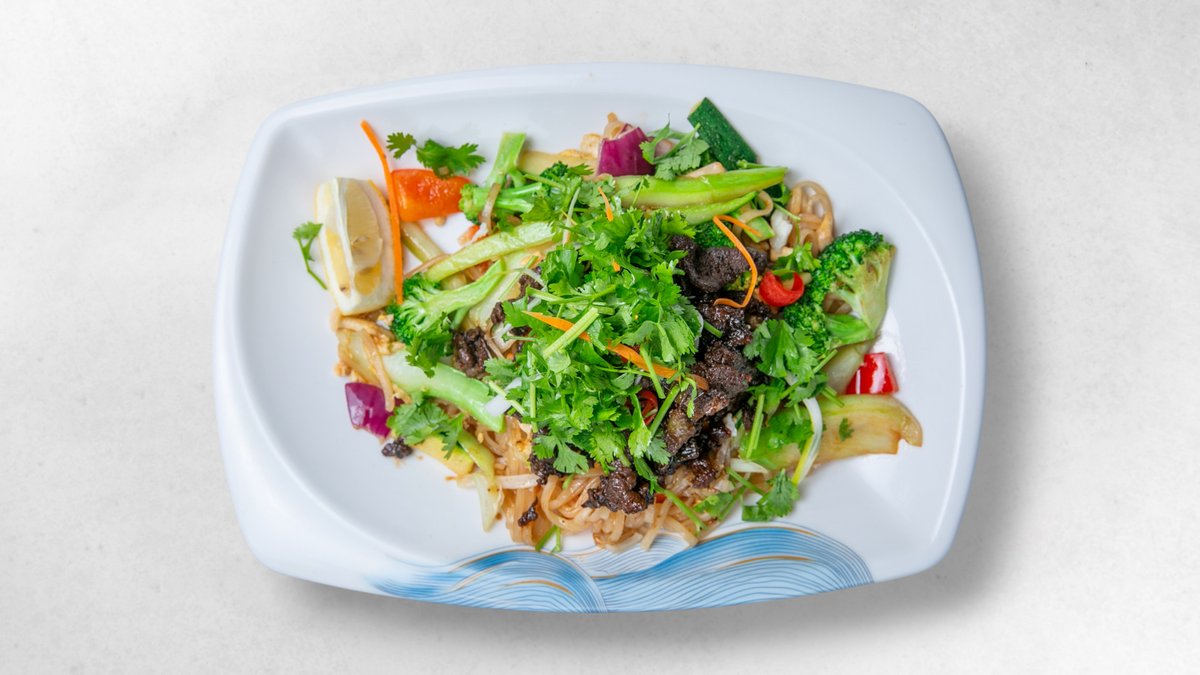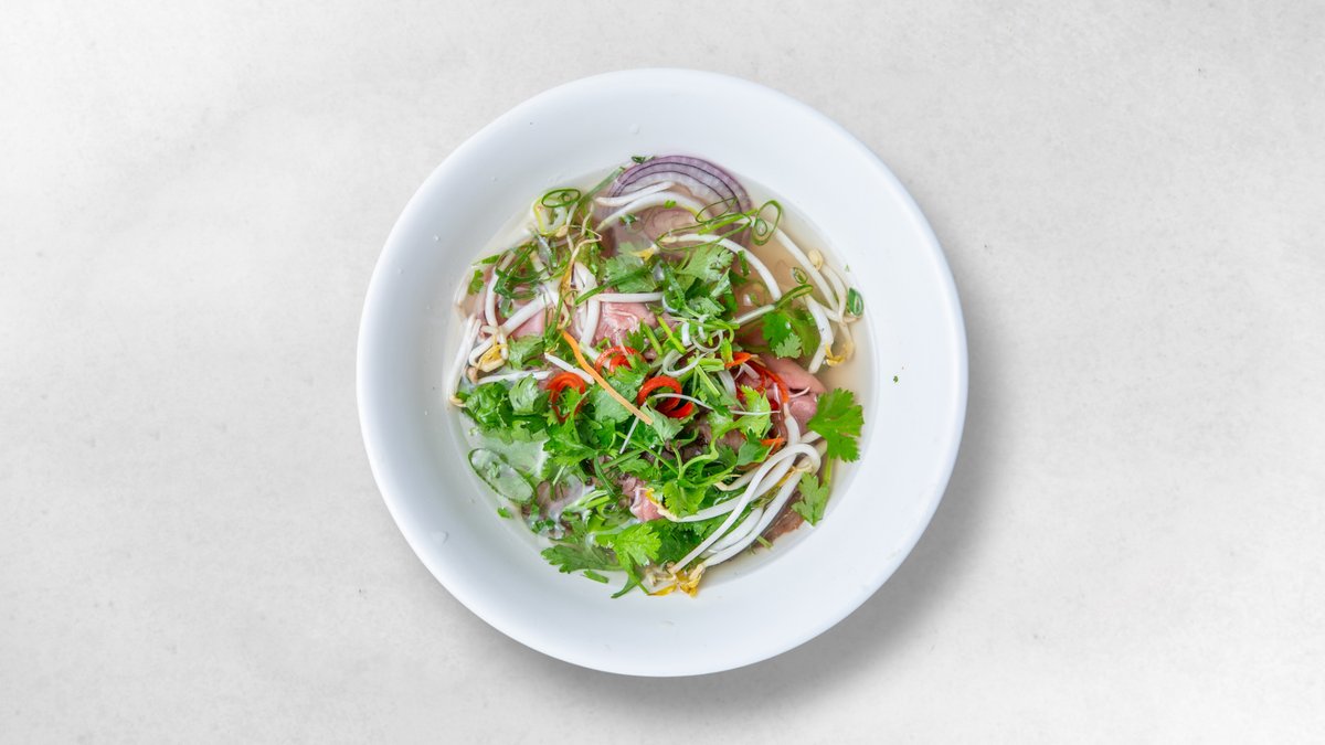 Alle Gerichte werden mit Reisnudeln, Sojasprossen, Lauch und frischen Kräutern zubereitet
