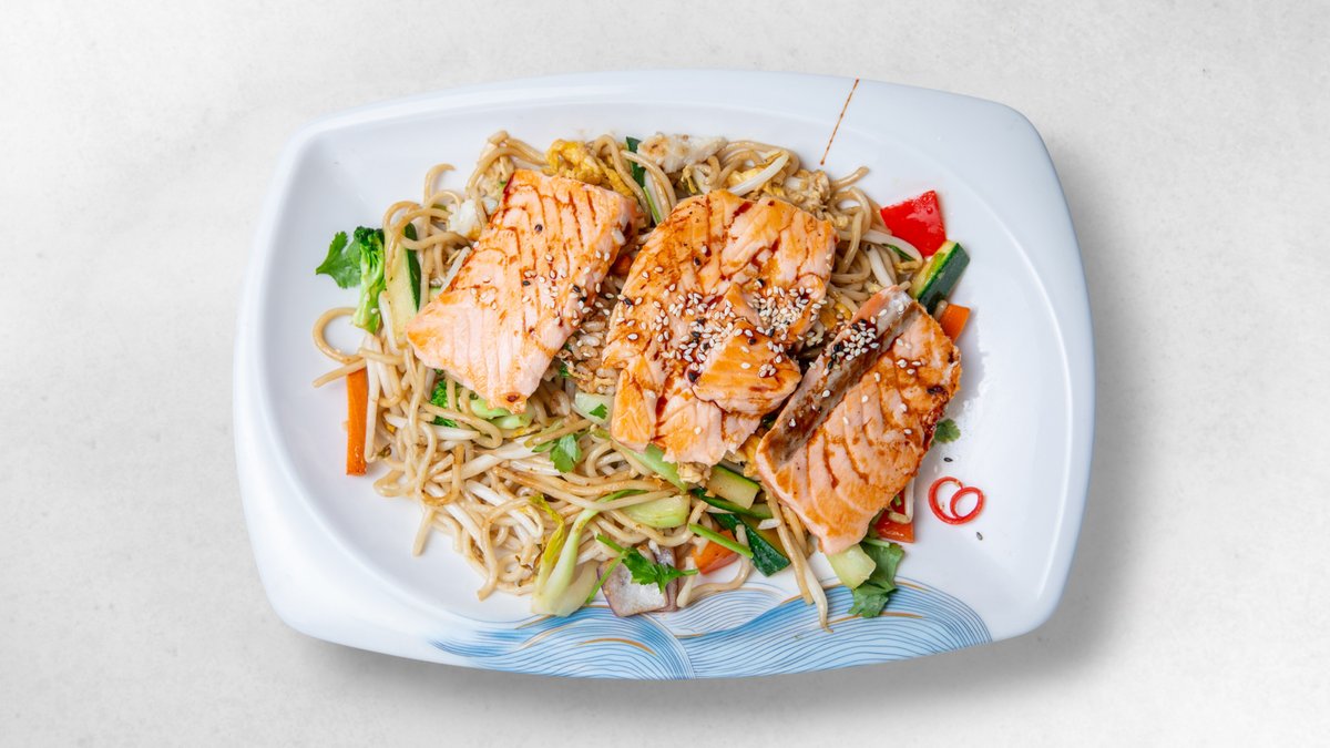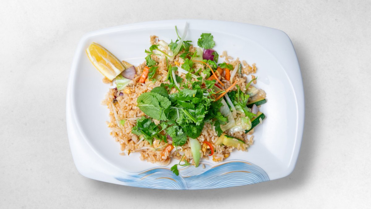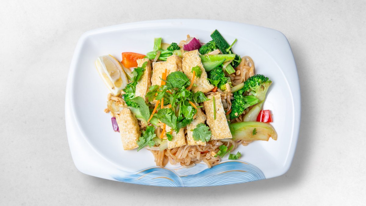 Alle Gerichte werden mit Salatmix, Frühlingsrollen, Erdnüssen, Limettensoße und frischen Kräutern zubereitet