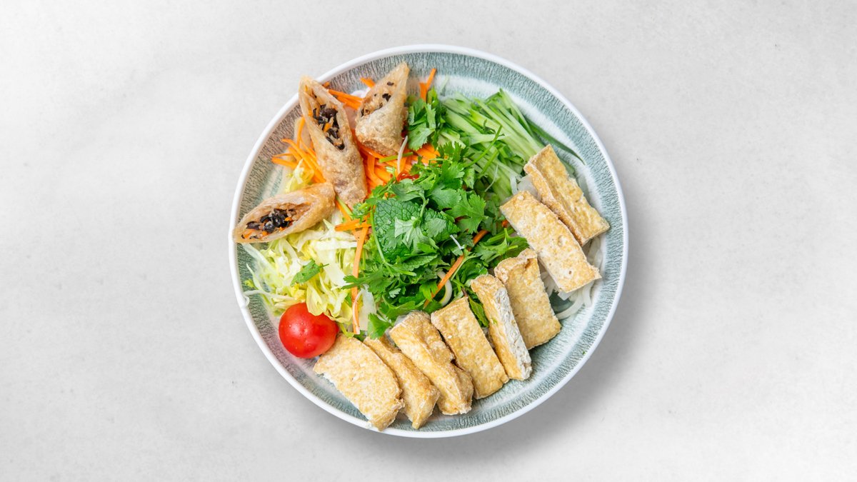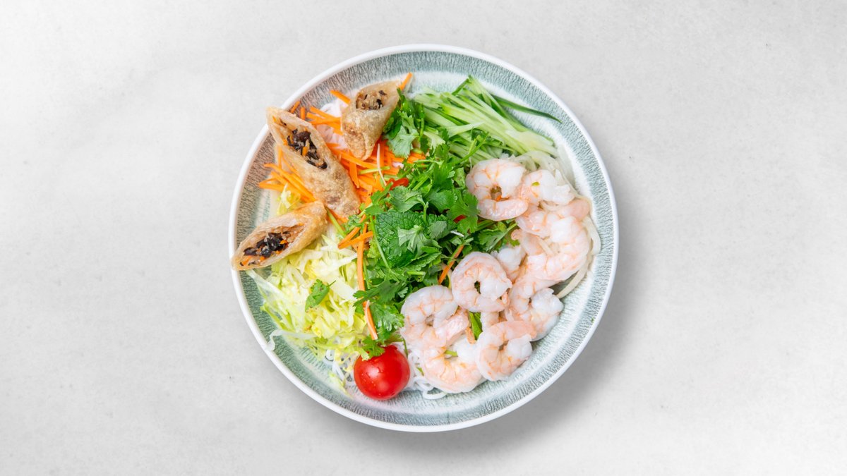 Reisnudeln, Frühlingsrolle, Eissalat, Gurke, Karotte, Basilikum, Erdnüsse, Röstzwiebeln, Nuoc Cham