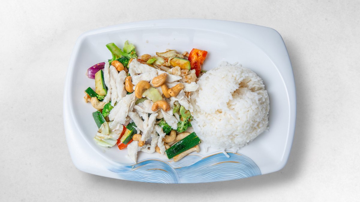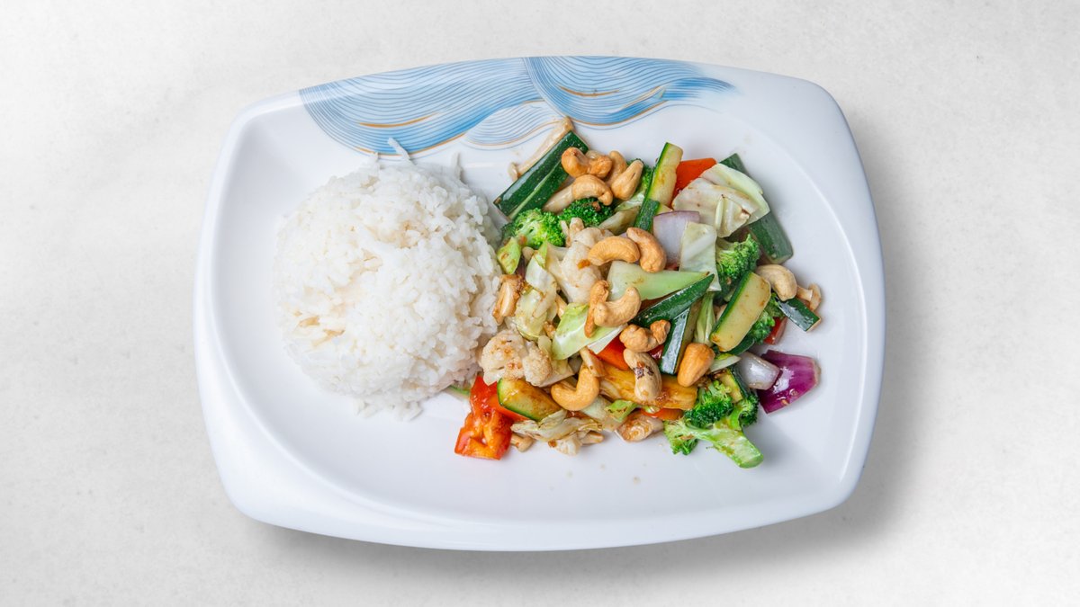 Alle Gerichte werden mit gebratenem Reis, Ei, Sojabohnen und Gemüse zubereitet