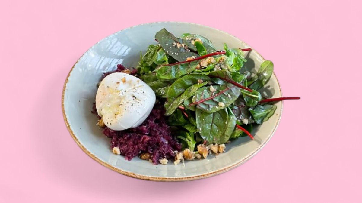Burrata, Rotkraut-Apfel-Tartar, roter Babymangold, Rucola, Vogerlsalat, Walnussdressing, geröstete Walnüsse