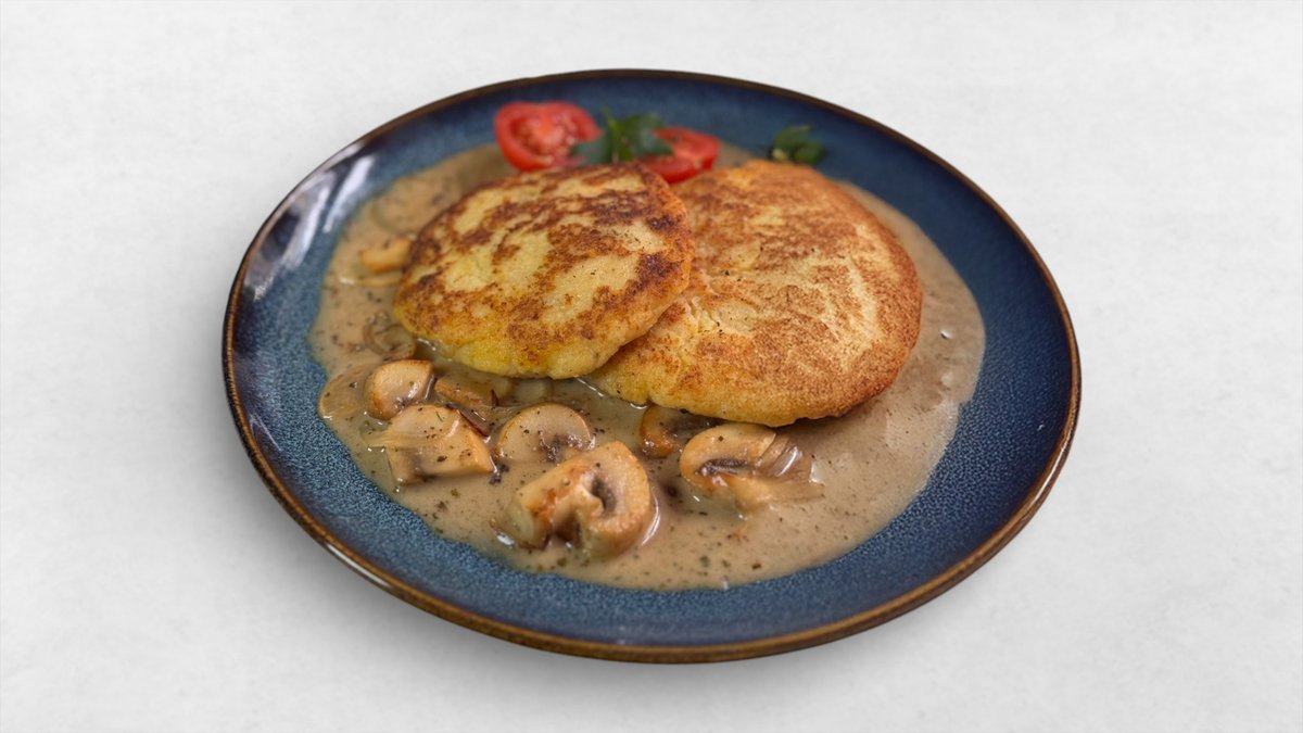 Goldbraun gebratene Pürreelaibchen mit cremiger Pilzrahmsauce und grünem Salat