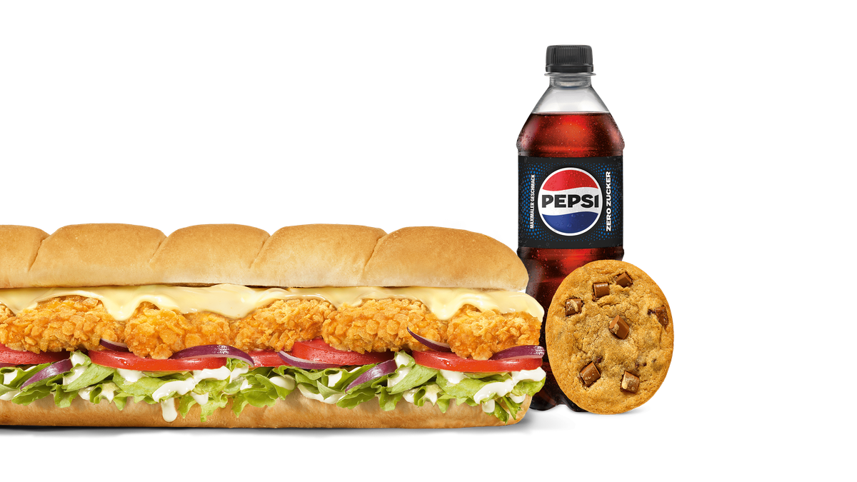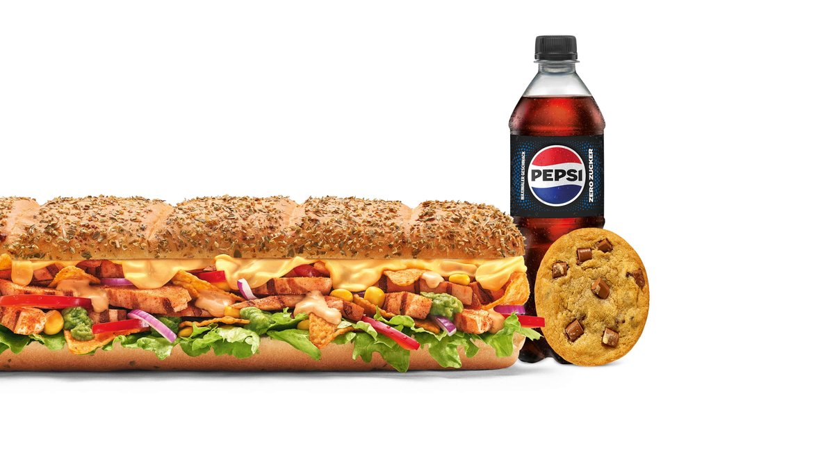 1 Fiesta Fajita Sub*, 1 drink and 1 side dish (Cookie, Chips or Waffle Fries Medium) *Fixed receipt formula: Fiesta Fajita Sub with chicken fajita, double sliced cheese, guacamole and Doritos Nacho Cheese, served with lettuce, red peppers, red onions, sweetcorn and chipotle Southwest sauce
