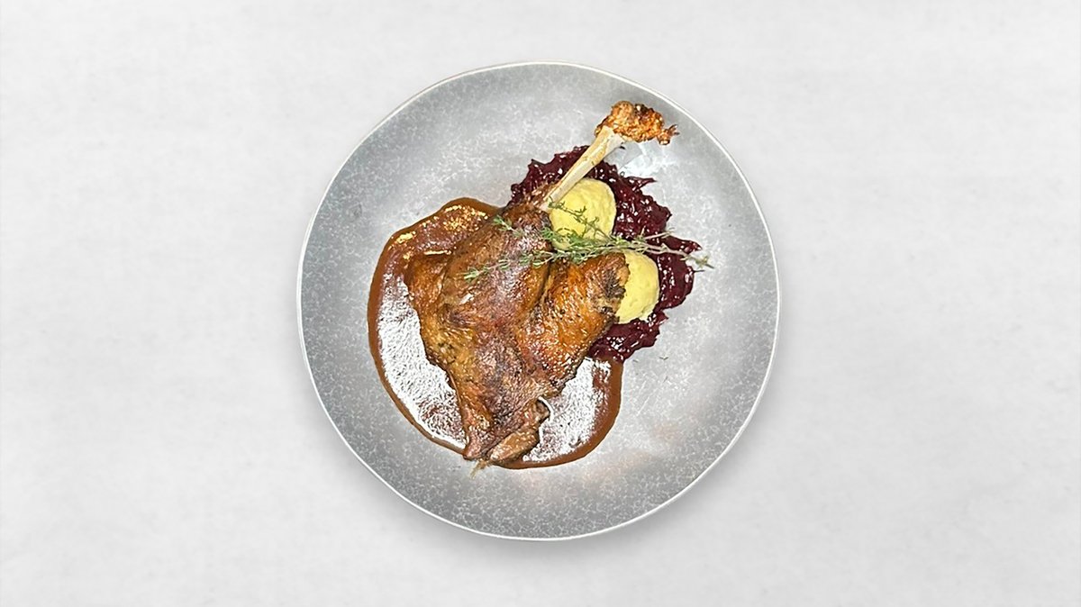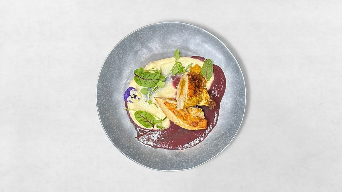 Kürbis & Maronifülle, Apfel-Selleriepüree & Rotkraut-Jus