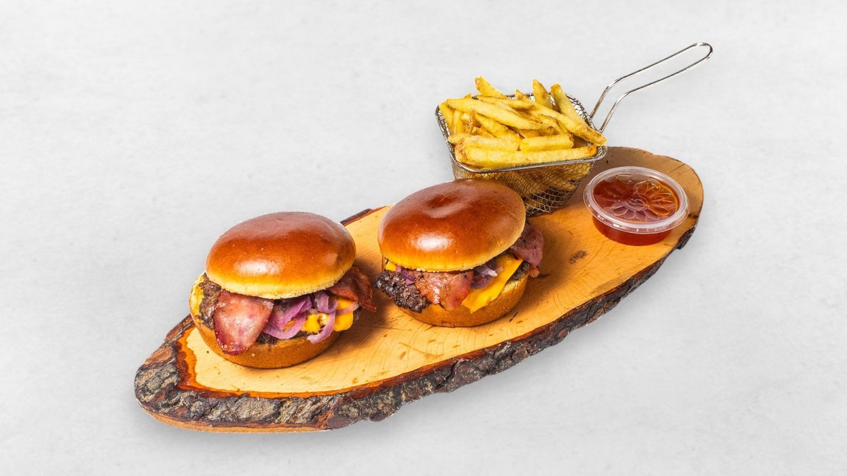 2x Bacon Bomb Smash Burger klein 1x Crispy Fries klein 1x hausgemachte Soße