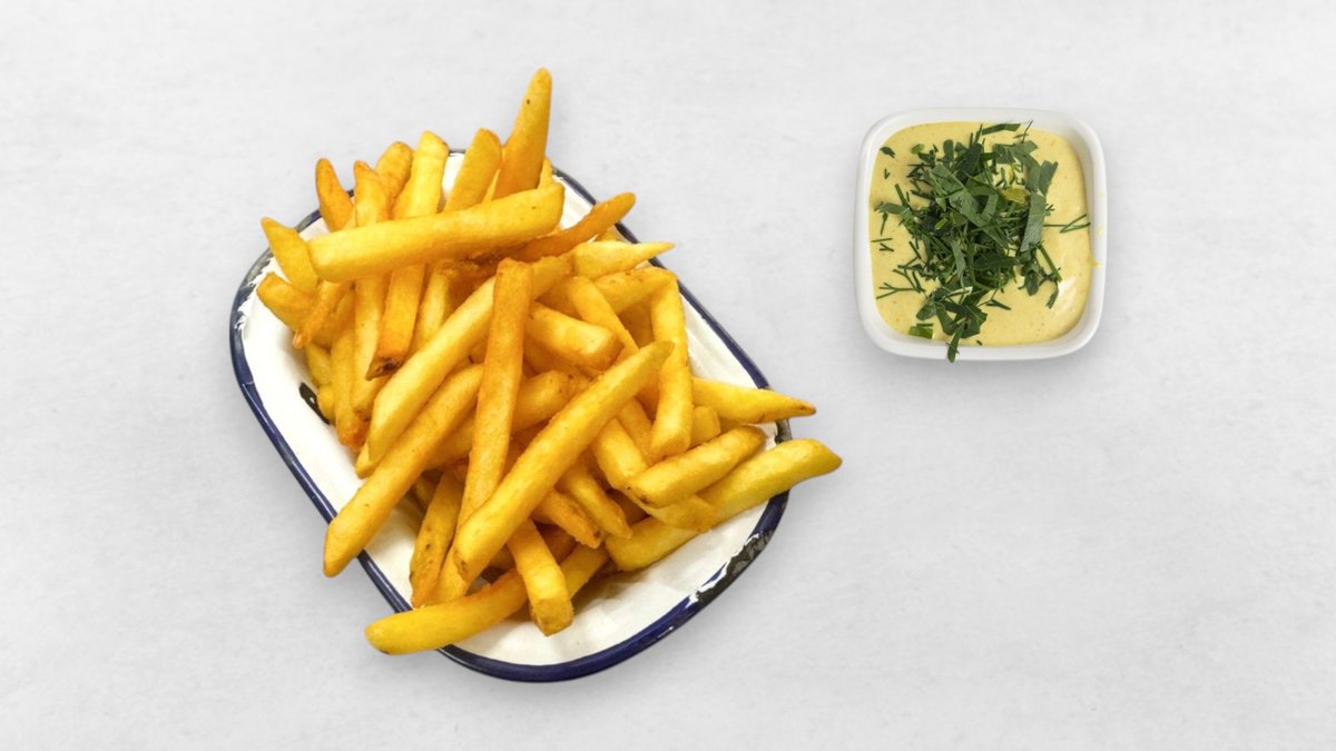 Doppelt frittierte Fries, dazu eine hausgemachte Soße