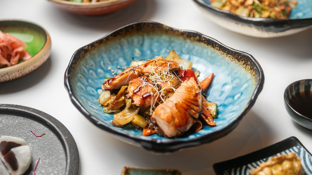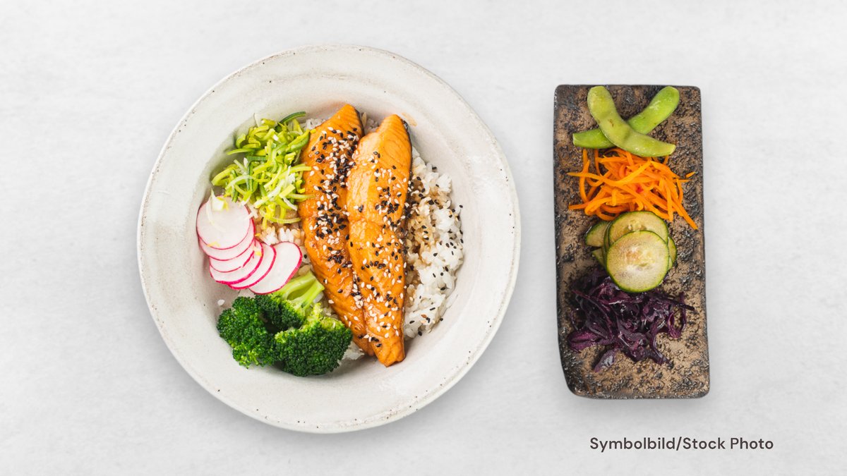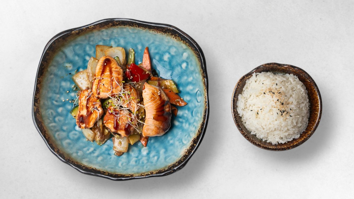 Gebratener Lachs, Gemüse, Teriyakisoße, Reis