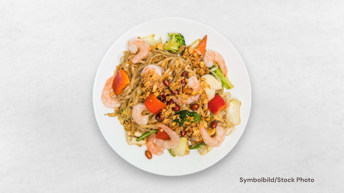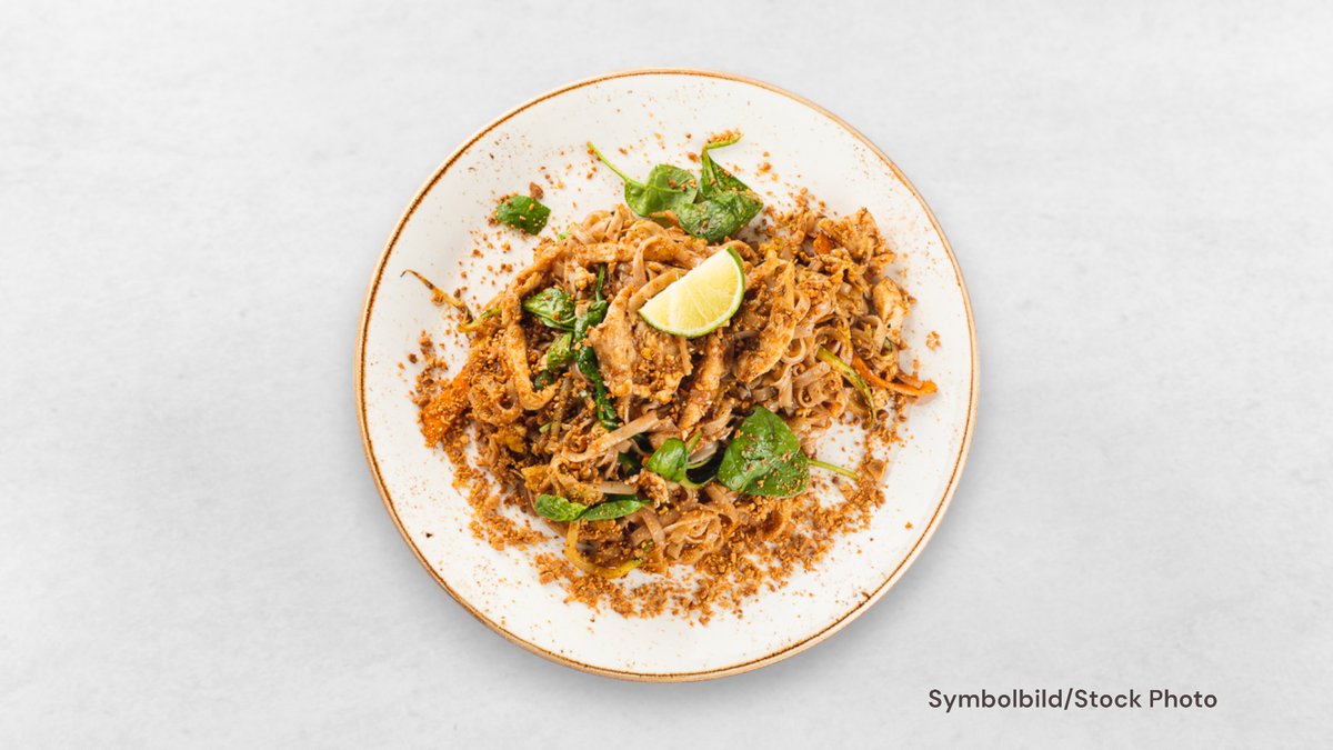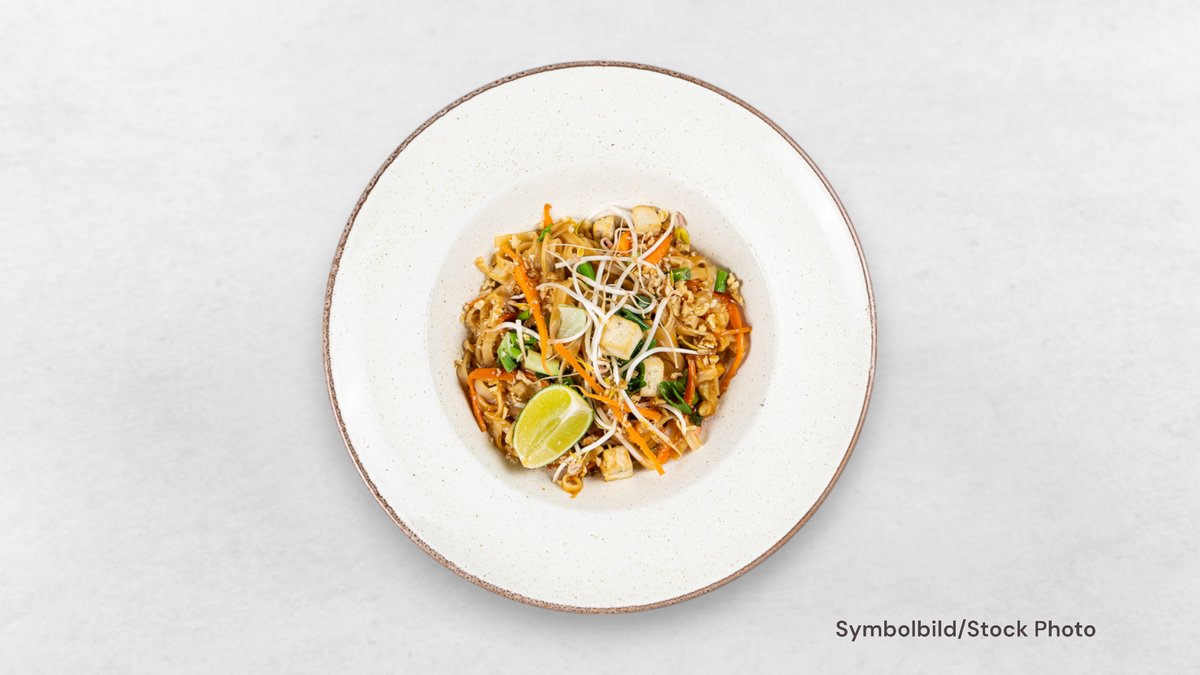 Gebratene Reisnudeln, Ei, Bärlauch, Sojasprossen, Erdnüssen