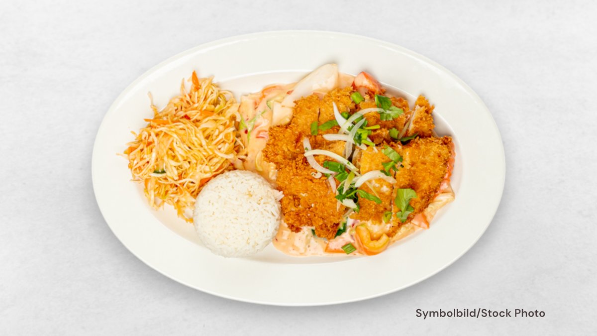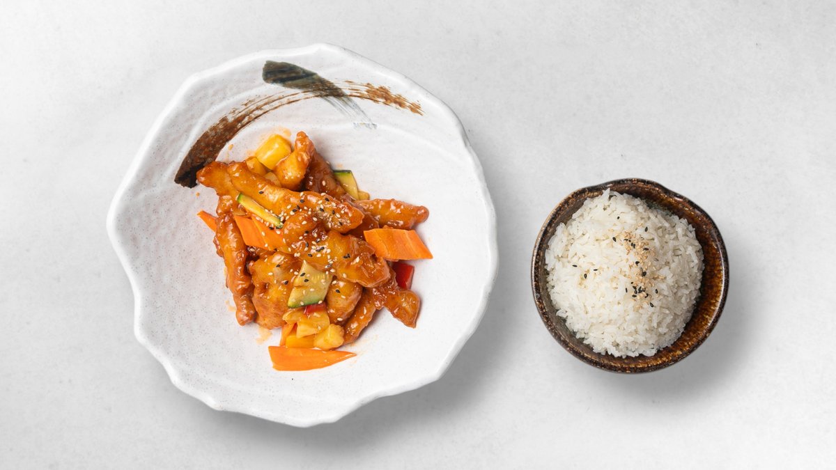 Huhn, Soße von Teppan auf Reis, süß-würzig