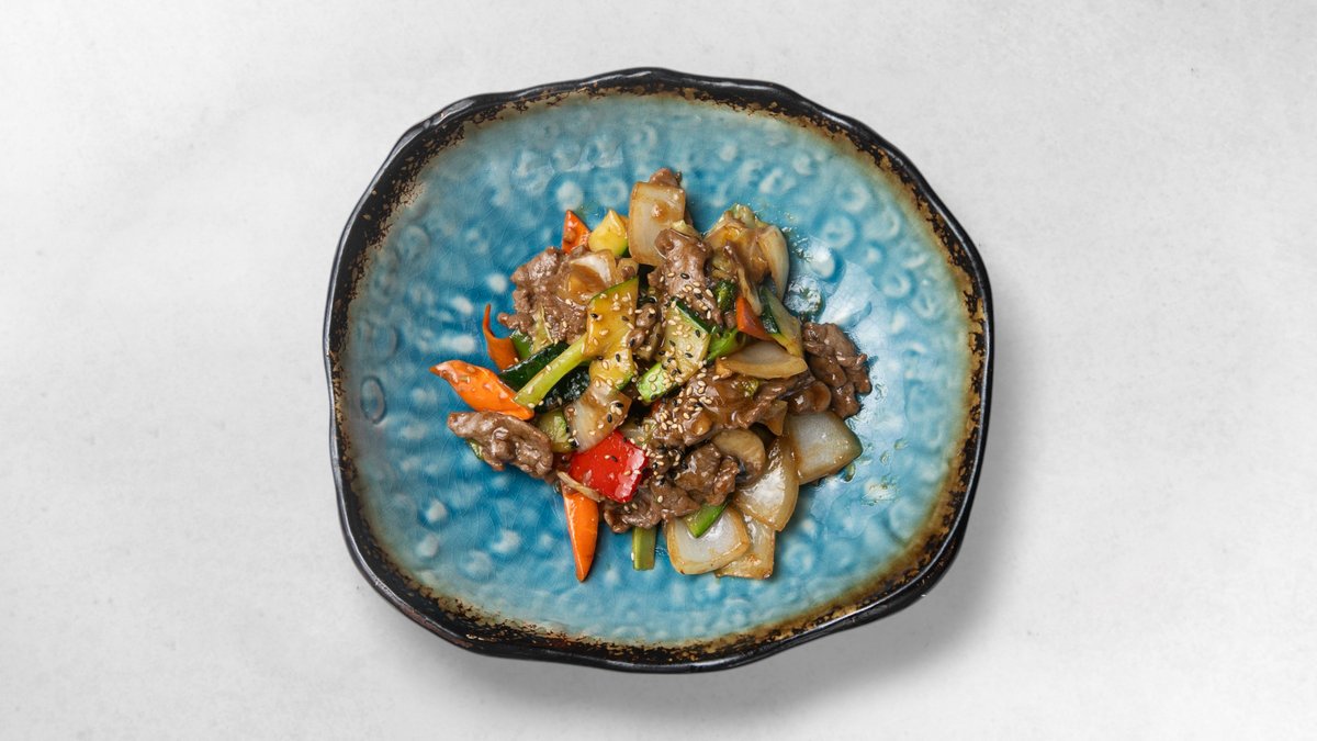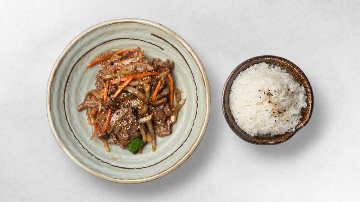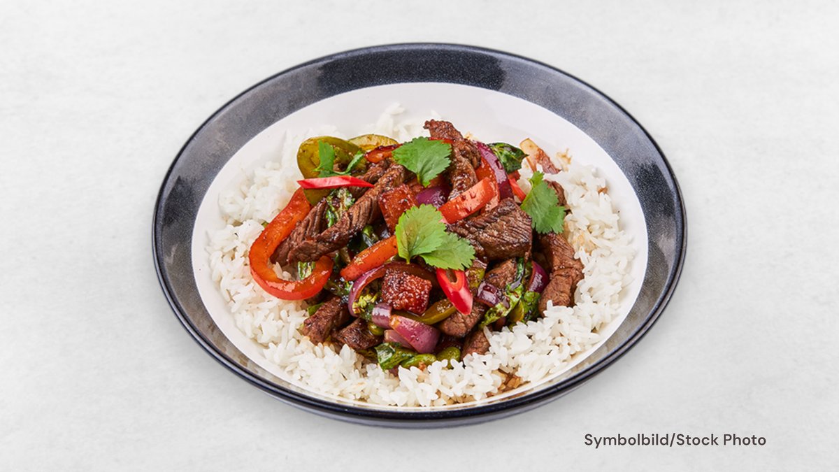 Mariniertes Rindfleisch, Zwiebel, Gemüse, Reis