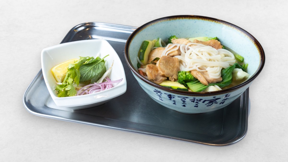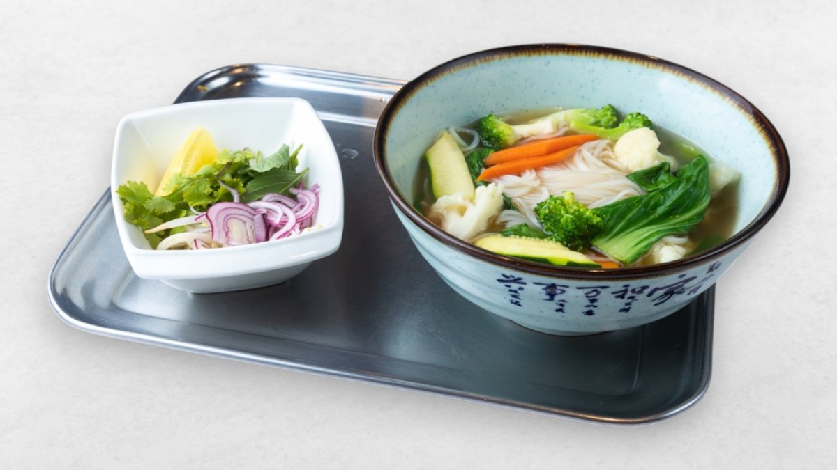 Vietnamesische Reisband-Nudelsuppe, Gemüse, frische Asiakräuter