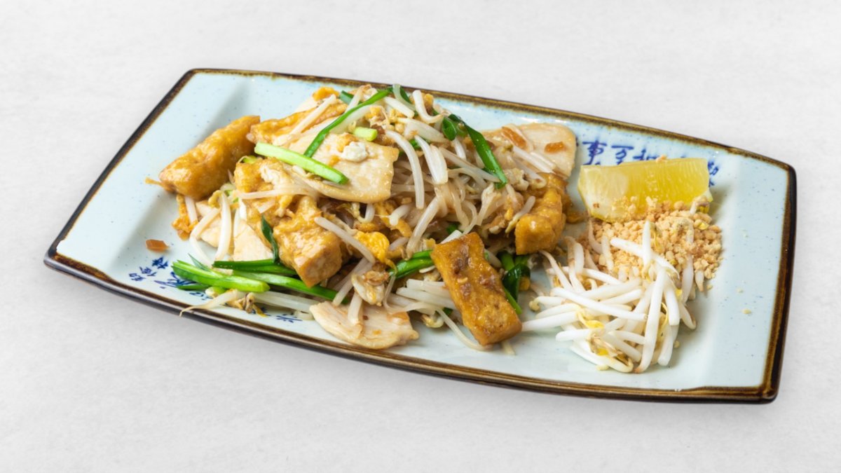 Ohne Reis, thailändische Reisbandnudel-Spezialität, Bärlauch, Sojapsrossen, Ei, Erdnüsse