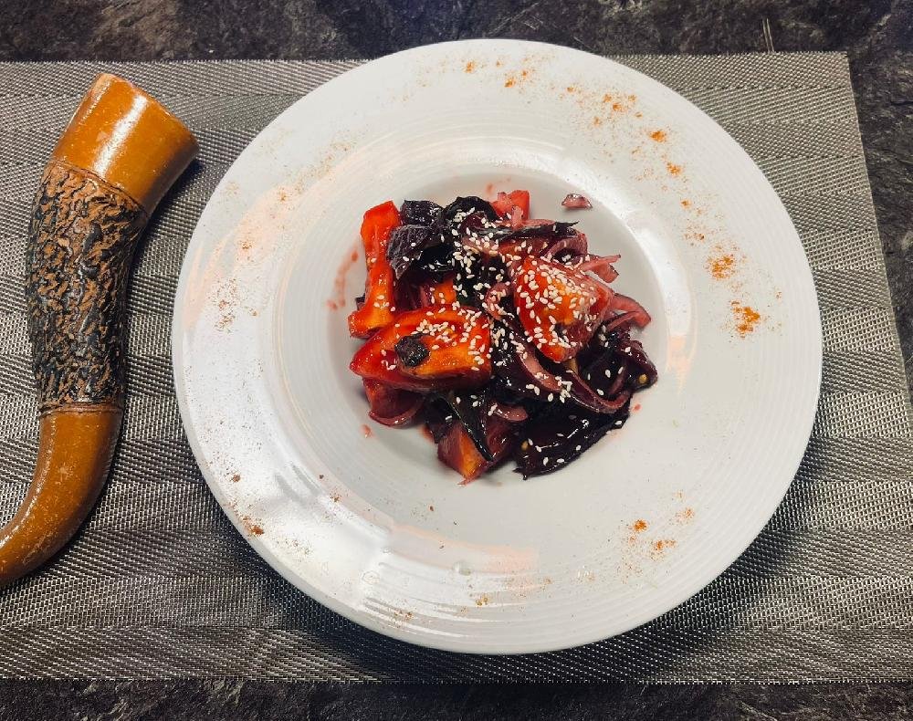 Albalı, pomidor, qırmızı sogan, reyhan, balzamik sousus, nar şərab