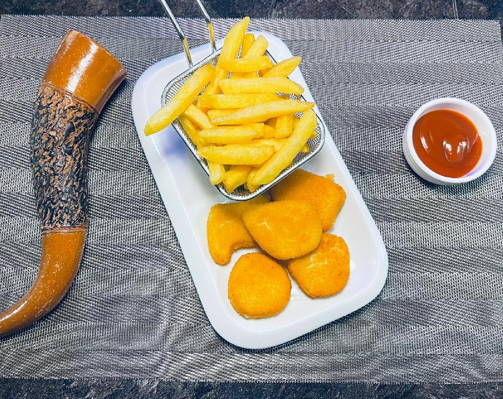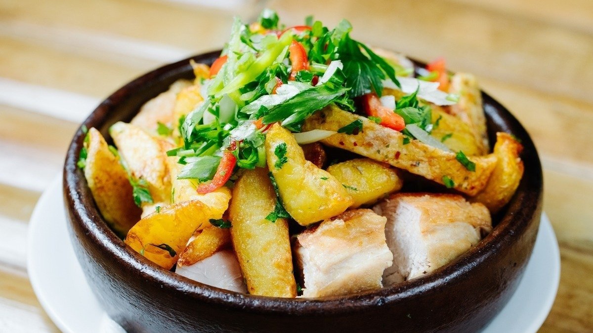 Kartof və göyərti ilə ələnmiş qızardılmış cücə