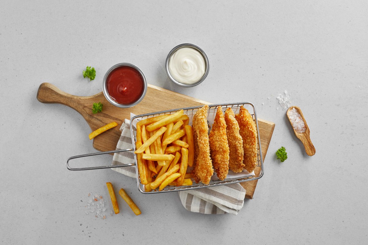 Suxari ilə panelənmiş toyuq çubuqları, kartof fri, ketçup və mayonez