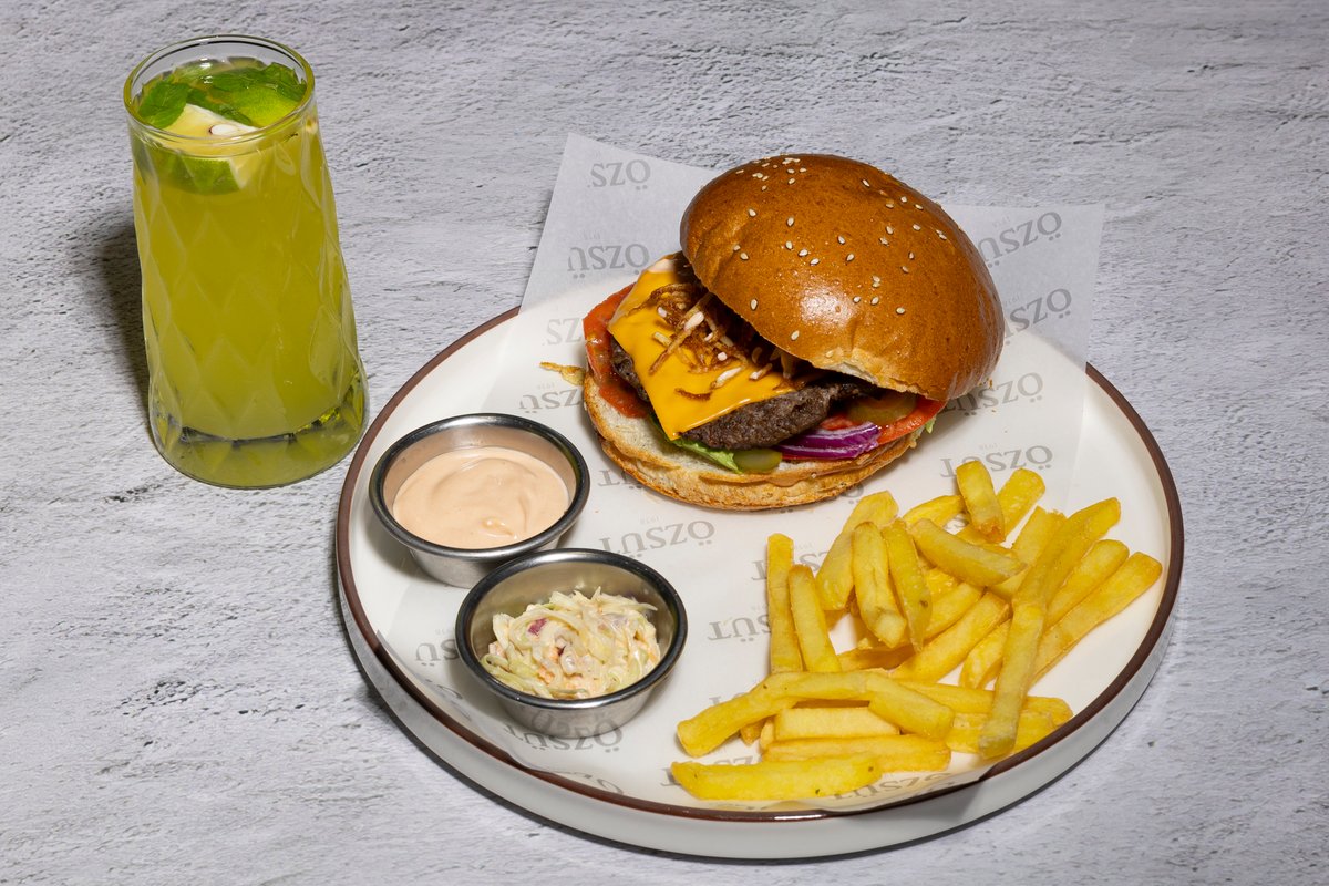Kokteyl souslu burger, kartof free, 1 ədəd Özsüt limonadı