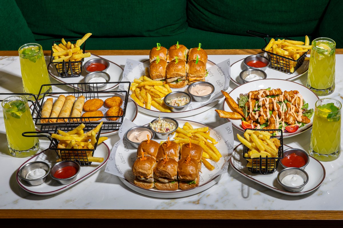 2 ədəd 6-lı mini chicken burger, 4 ədəd kartof free, Crispy salat, Naggets, siqara böreyi, 4 ədəd Özsüt limonadı