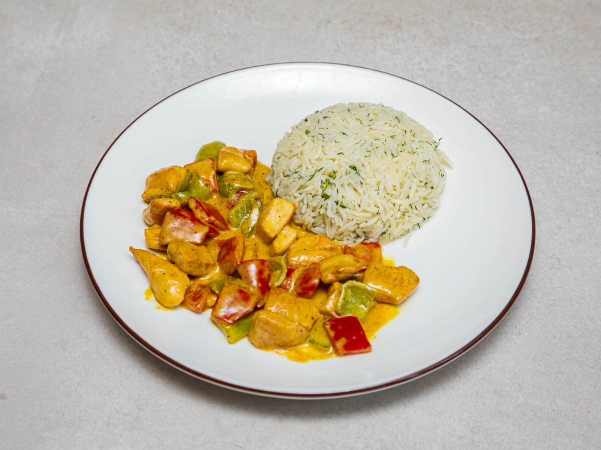 Toyuğun bud dibi, soğan, sarımsaq, qaymaq, köri sousu, düyü.