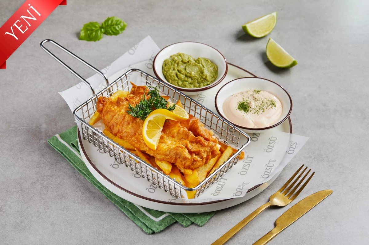 Forel balığı, un, yumurta sarısı, avokado sousu, burger sousu, limon, cəfəri, steak french fries