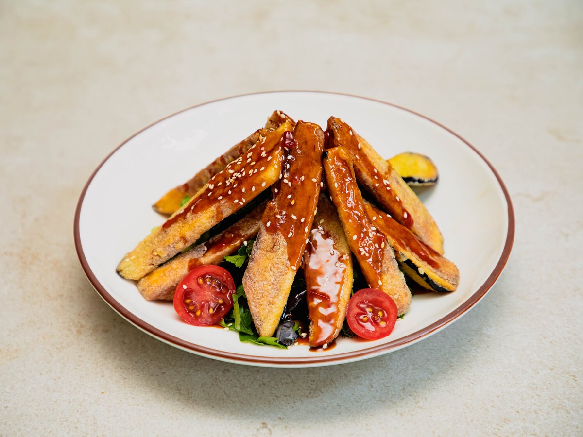 Badımcan, nişasta, göyərti, ağ küncüt, bal, soya sousu, sweet chilli, çerri pomidoru, un