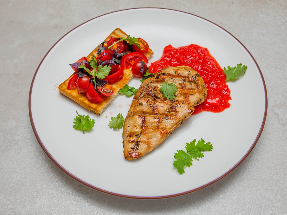 Tomat sousu, toyuq, parmesan pendiri, aysberq kahısı, sezar sousu, pomidor, mozzarella pendiri ("Kasemeister")