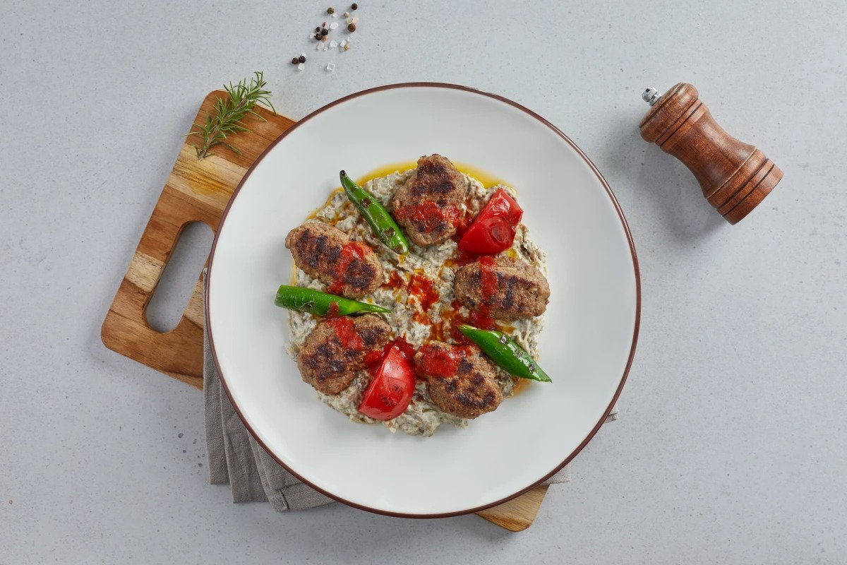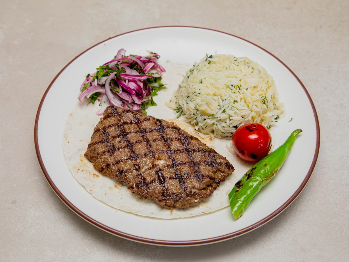 Xüsusi hazırlanmış toyuq köftesi, kahı, duzlu xiyar, pomidor, pendir, kartof fri və miks-kələm salatı