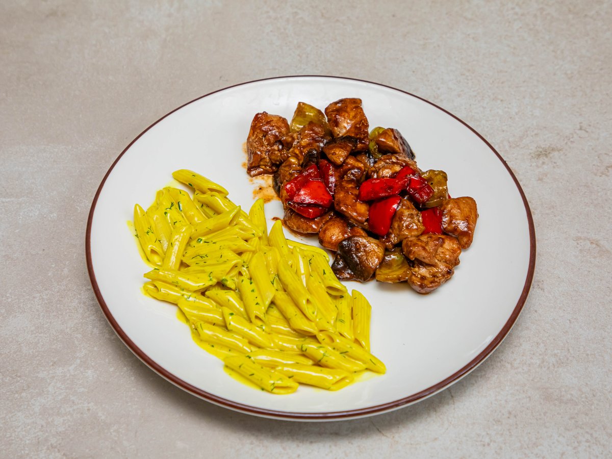 Toyuğun bud əti, bbq sous, soğan, qırmızı və yaşıl bibər, göbələk, makaron.