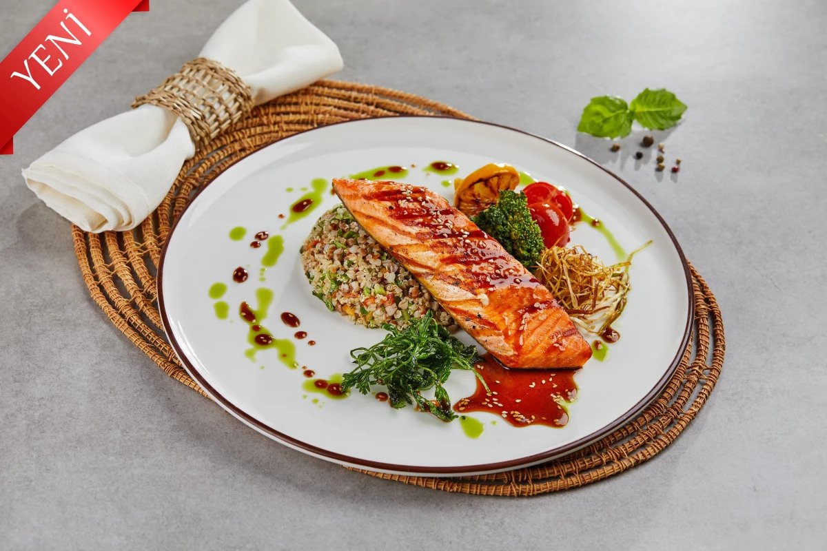 Salmon balığı, kapers, pomidor çeri, sarımsaq, limon, rukola, meyvə albalı