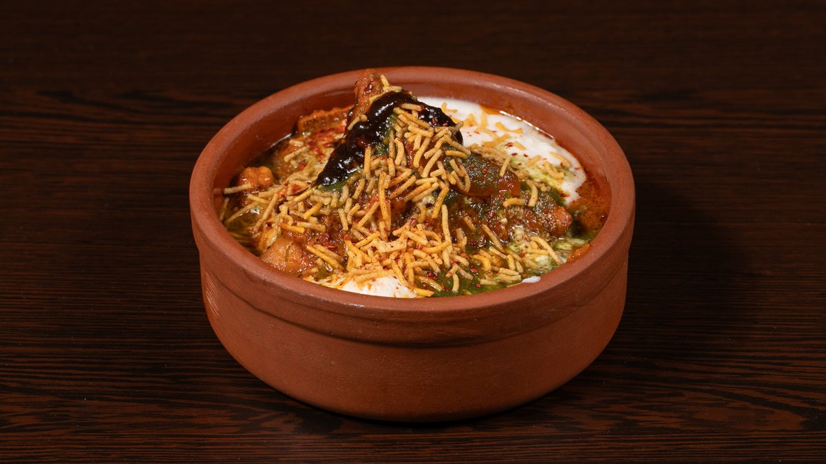 Qatıq, tamarind, nanə və xırtıldayan kartof ilə samosa