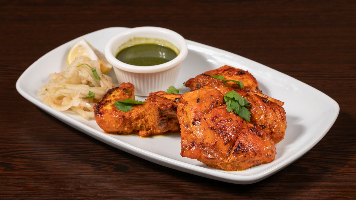 Soğan, pomidor, qatıq və ədviyyatlı qrildə bişmiş toyuq tikka
