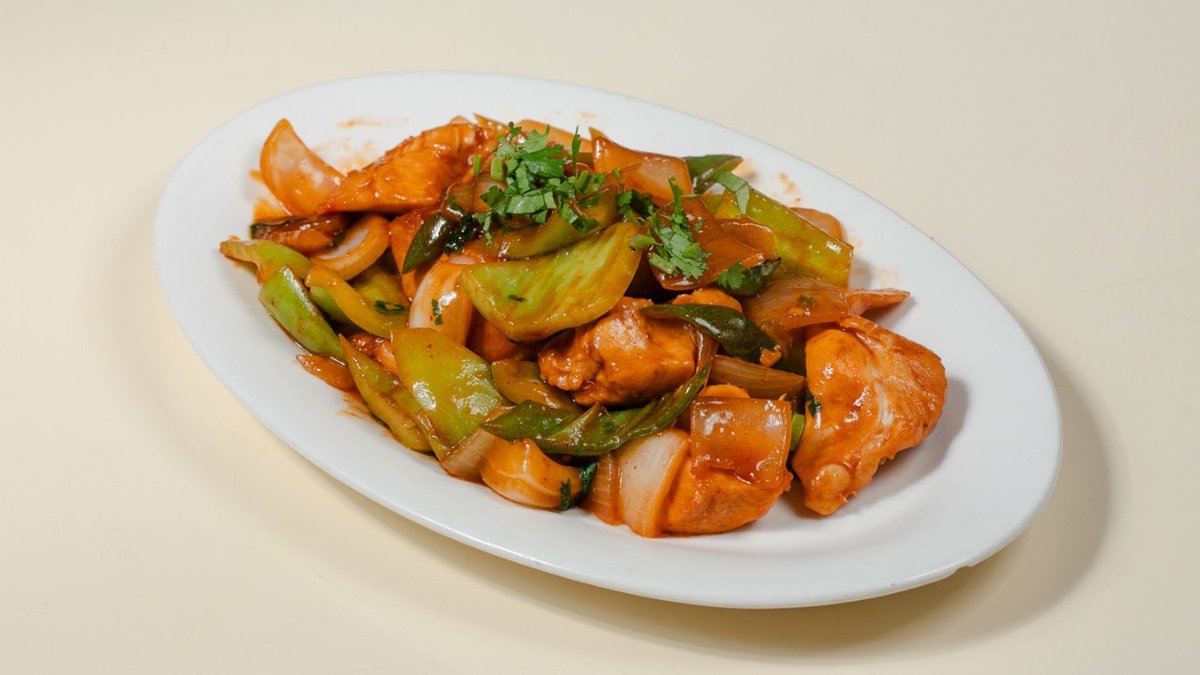 Çili, sarımsaq, kərəviz, pırasa və soya ilə qızardılmış toyuq kubları