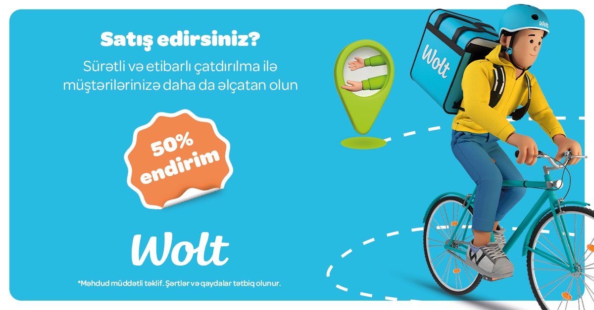 We’re excited to introduce Packages – Wolt’s brand-new service! 🥳 Now sending and receiving parcels in your city is simple and fast. Whether it’s a gift, a personal item, or something you buy and sell online – it will be delivered door-to-door in just one hour or less. 📦 Sending personal items with Wolt is incredibly convenient. You and the recipient can track the parcel in real time – even if the recipient doesn’t have the Wolt app. That means total peace of mind for both sides. 👍 And the best part is, you don’t have to wait – try Packages today and get 50% off your order! 🚀 *Now available in Baku, Sumgait, Khırdalan, Ganja, Nakhchivan, Lankaran, Khankendi and Mingachevir.