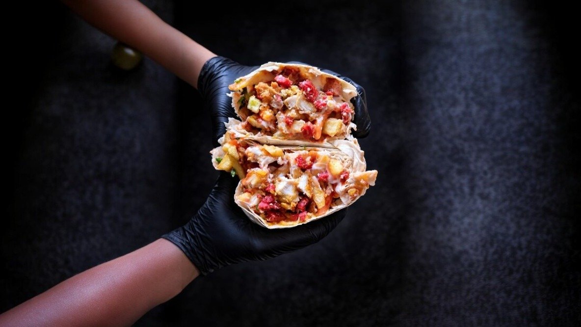 Şaurma sousu, strips, kartof fri, duzlu xiyar, pomidor