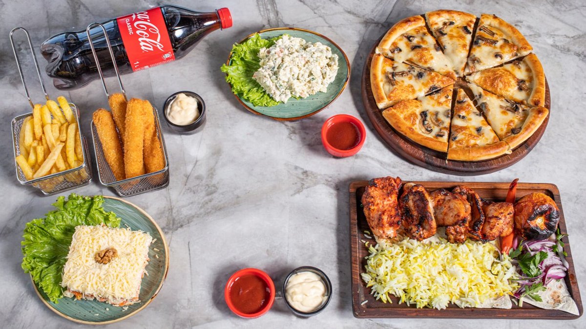 Qarışıq Pizza - 28sm, Sade Lahmacun - 3 əd., Paytaxt salatı, Vişnəli pomidor salatı, Manqal salatı, Çoban salatı, Toyuq salatı, Toyuq kababı , Lülə kabab, Tikə kabab, Izqara toyuq, Toyuq lüləsi, Ciyər kababı, Tərəvəz kababı, Plov, Təbii şirə - 1L, Kola- 1L